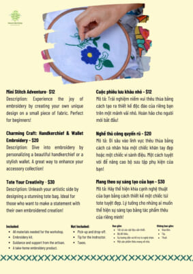 Currently, we are a leading organizer of embroidery workshops in Tam Coc, offering daily sessions. We design our programs in diverse settings, from artisans’ private homes and farms to gardens and natural eco-areas. Through our programs, many artisans have improved their incomes, helping them to sustain their craft. At present, there is no economic support policy for traditional artisans in Vietnam, making this initiative even more impactful for their livelihoods.